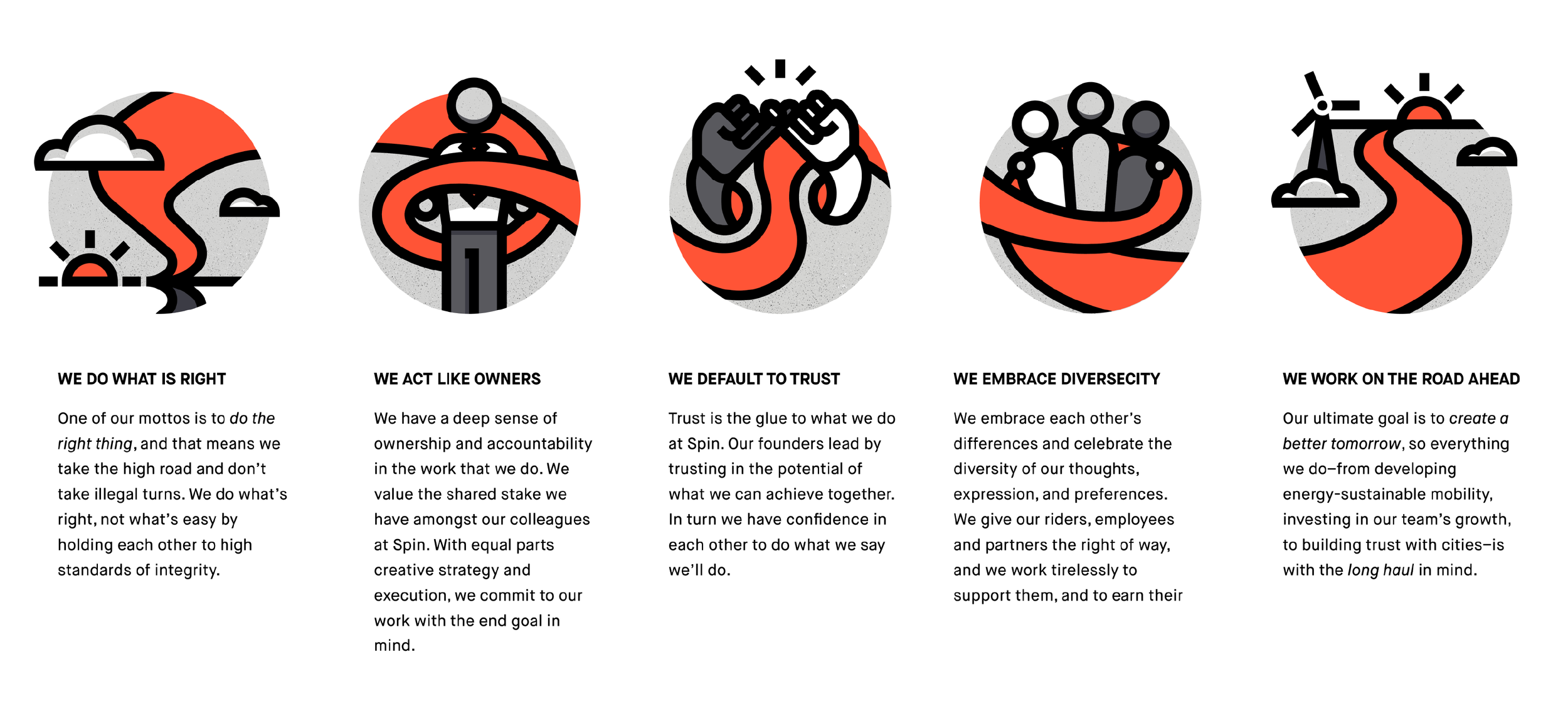 Spin revised their values half-way through my tenure and requested new iconography to represent them. As I began exploring each of the concepts, the idea of a single orange road that traveled fluidly across all 5 icons emerged. Of course, the icons needed to work individually as well, in case they didn’t appear in order, but I particularly like how the road starts and ends with the sun when ordered like this. This is the kind of clever design I particularly appreciate…